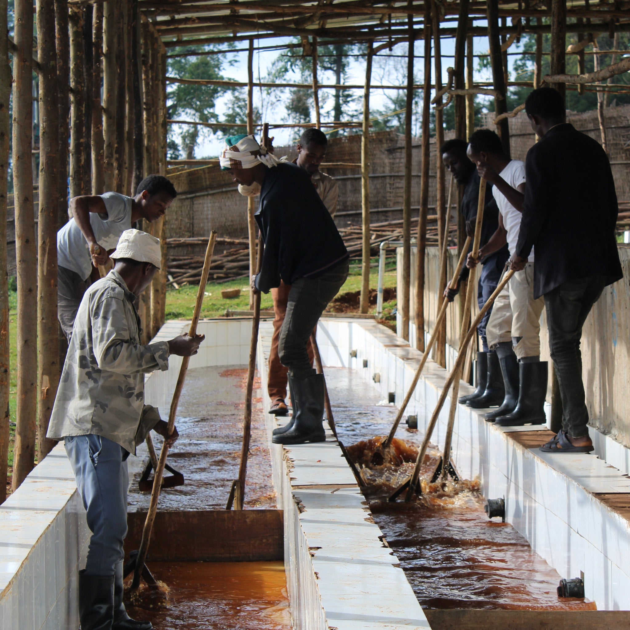 The cherry ferments inside the black plastic for 48 hours. During this time, natural fermentation breaks down sugars in the coffee cherries which produce lactic acid, carbon dioxide, and unique flavor compounds.