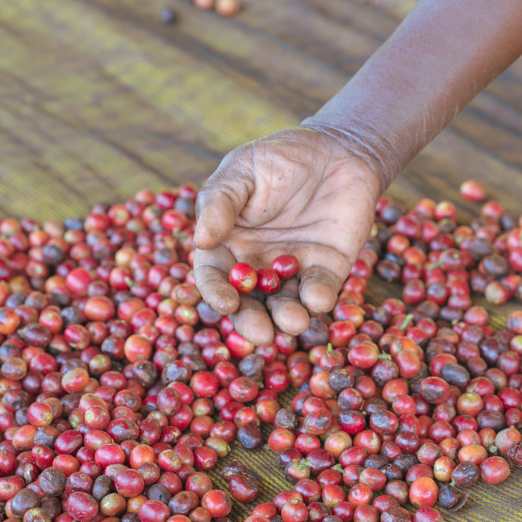 乾燥ベッドでは、作業員がコーヒー豆を頻繁にかき混ぜ、均一に乾燥させ、日中の最も暑い時間帯にはカバーをかけ、ゆっくりと均一に乾燥させています。