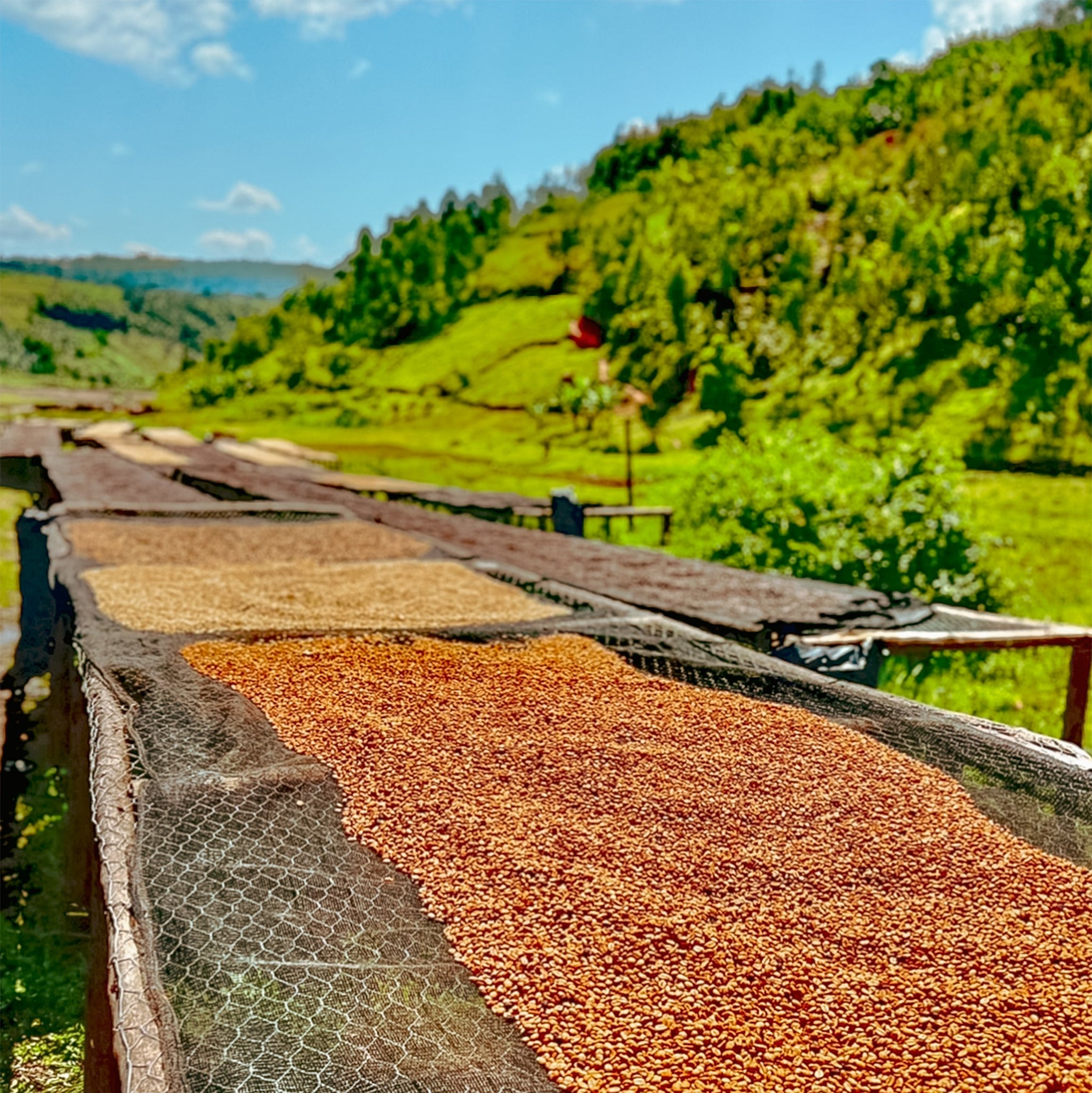 The Humure washing station, where 1500 small hold producers deliver their coffee cherries, is named after the highest hill in the area. It is unusual in Rwanda as the station is run entirely by women. At Humure the cherries are sorted by farmers and further sorted manually by staff, who then float the cherries to check their density. Only cherries that pass both visual and floating sorting are accepted.